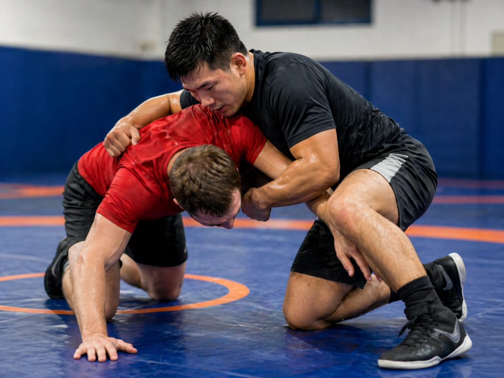 - single-leg → อีกฝ่ายกดหัว → เปลี่ยนไป front headlock